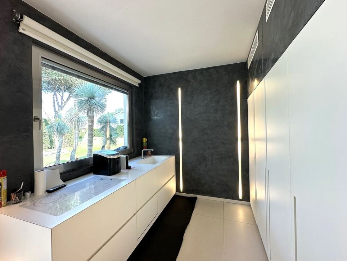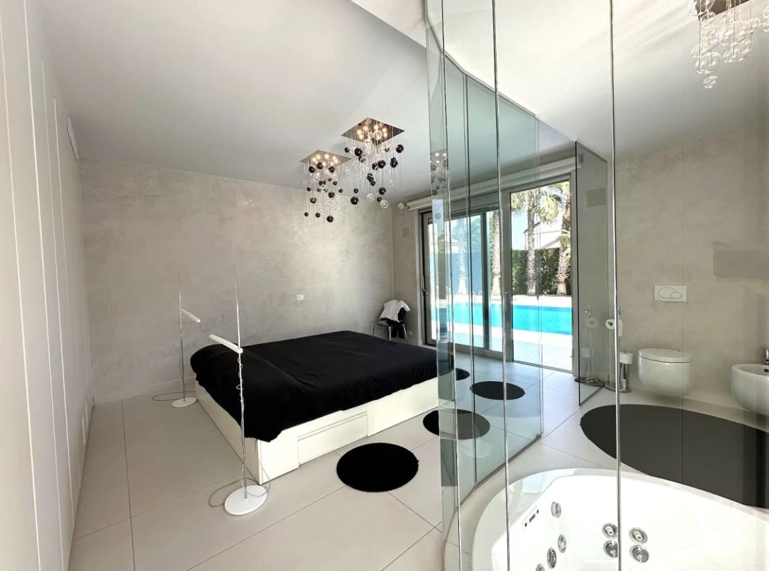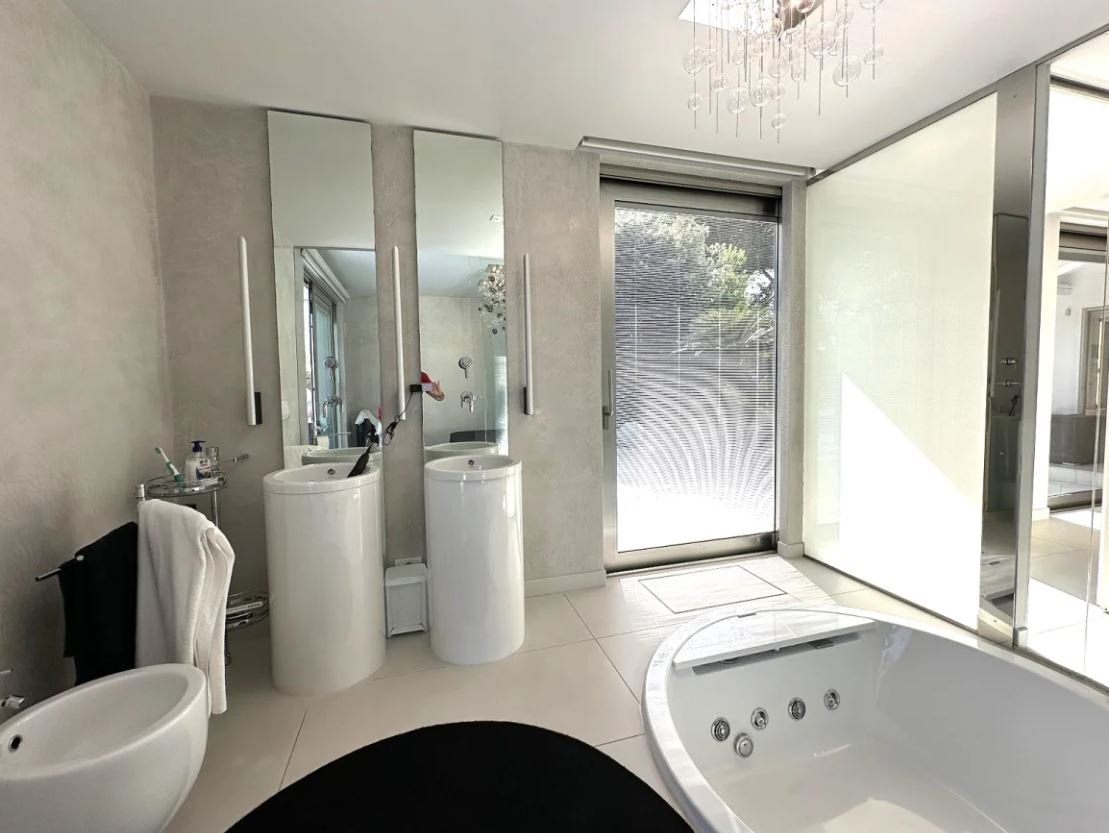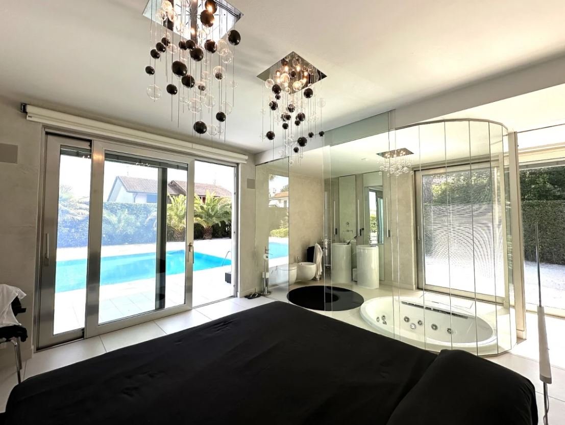 Sonstige Besonderheiten Ein eigenes Badezimmer, das von Glaswänden umgeben ist, die sich dank einer speziellen Sensortechnologie beim Betreten verdunkeln, und eine Super-Whirlpool-Badewanne, die durch eine verdunkelbare Glaswand mit elektrischen Jalousien auf den Außenpool blickt. Großer Infinity-Pool, umgeben von einer großen Terrasse, ideal zum Sonnenbaden, und viel Privatsphäre inmitten einer üppigen, gepflegten tropischen Vegetation. Im Untergeschoss befindet sich eine Doppelgarage, die über eine bequeme Rampe erreichbar ist. Photovoltaikanlage, Solarthermie (die den Pool beheizt), maßgeschneiderte Hausautomation zur Fernsteuerung: Alles wurde bis ins Detail durchdacht, um Ihnen den bestmöglichen Aufenthalt zu garantieren.