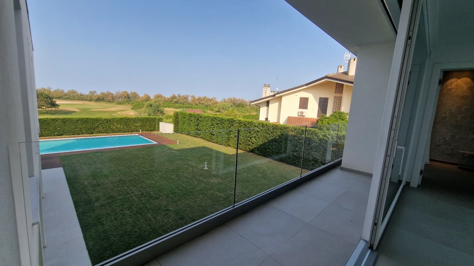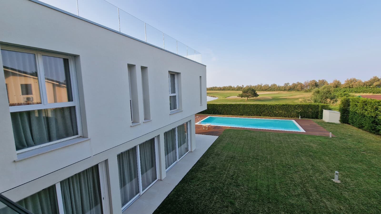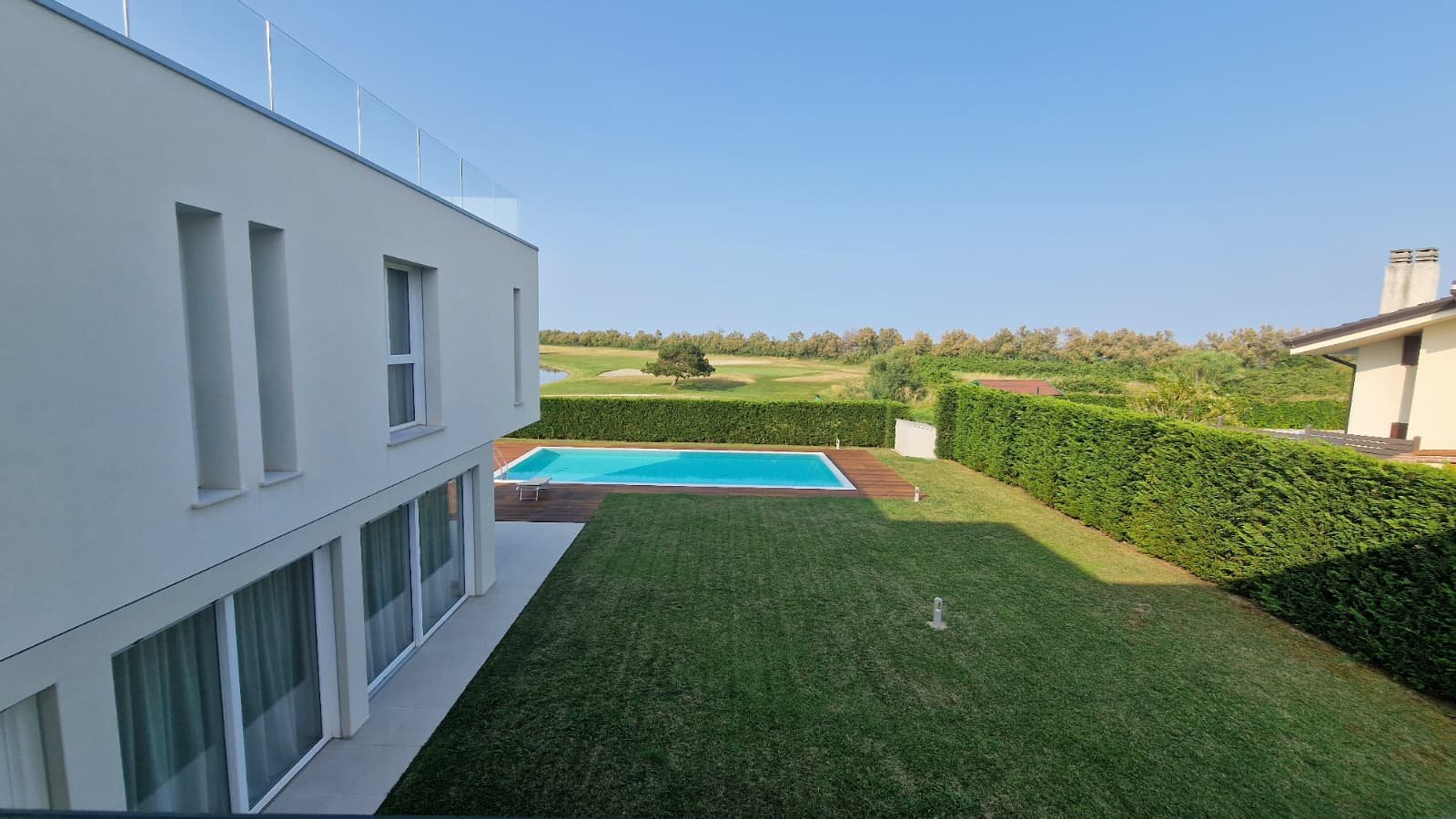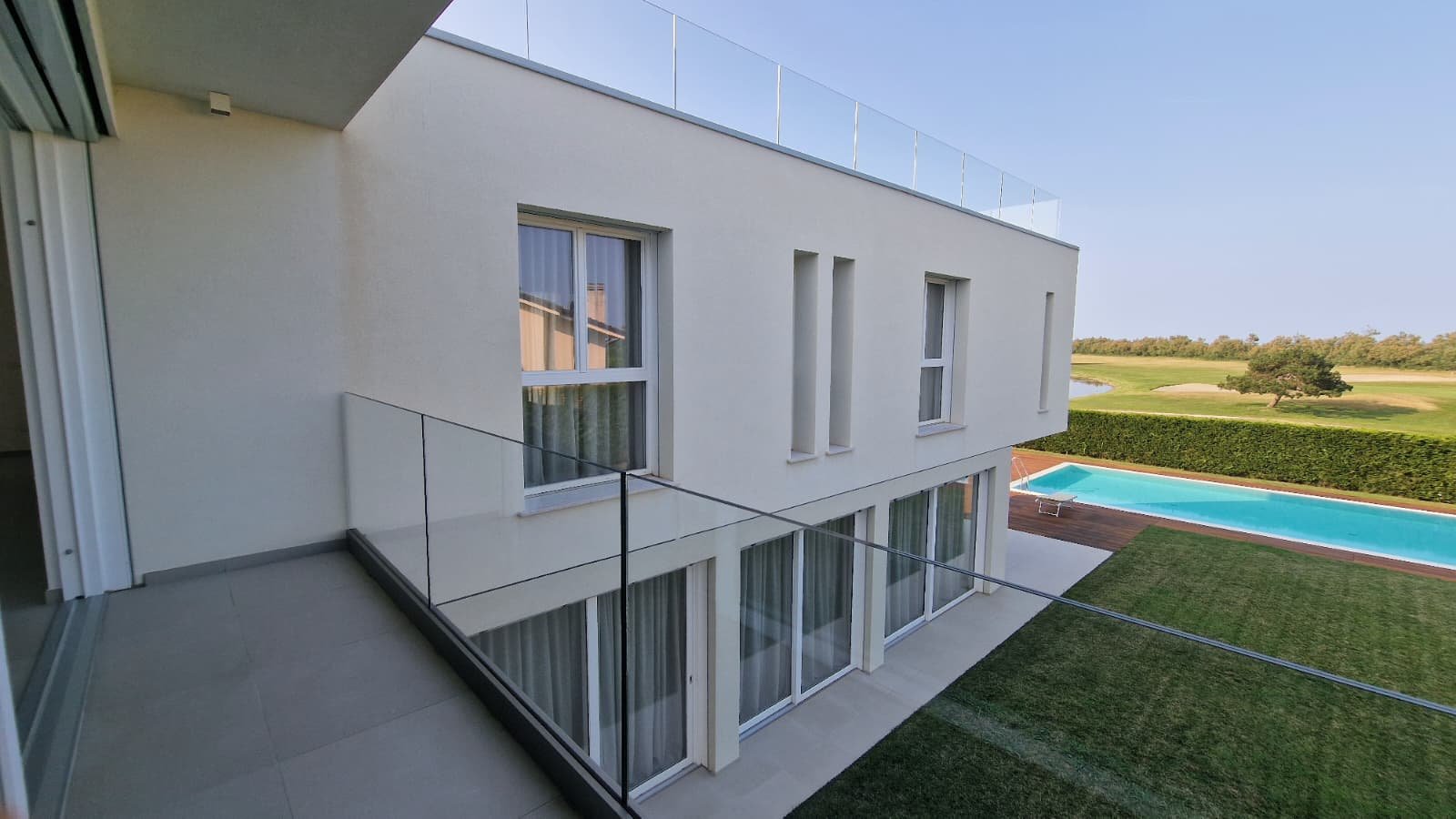 Die Villa erstreckt sich über 450 m² auf drei Ebenen und steht auf einem großzügigen Grundstück von 1.300 m². Lichtdurchflutete Räume, offene Glasfronten und ein fließender Übergang von innen nach außen schaffen ein Wohngefühl voller Leichtigkeit. Das Konzept: maximale Nähe zur Natur. Von jedem Raum aus schweift der Blick über den gepflegten Garten, den weitläufigen Pool und das satte Grün des Golfplatzes.