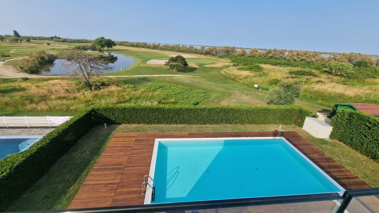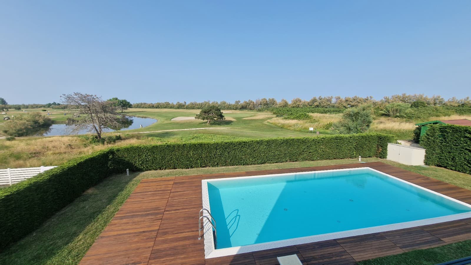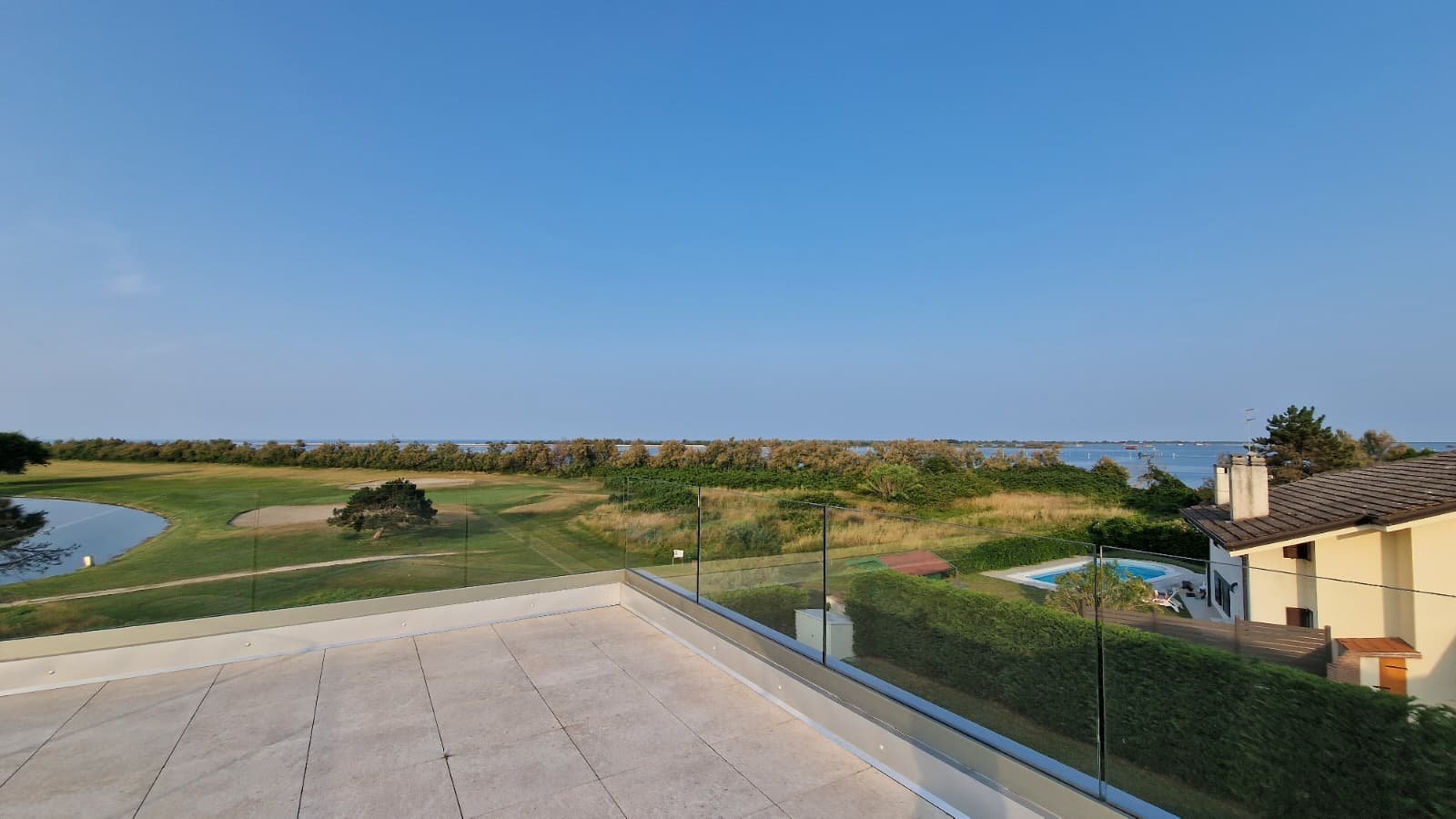 Die Villa erstreckt sich über 450 m² auf drei Ebenen und steht auf einem großzügigen Grundstück von 1.300 m². Lichtdurchflutete Räume, offene Glasfronten und ein fließender Übergang von innen nach außen schaffen ein Wohngefühl voller Leichtigkeit. Das Konzept: maximale Nähe zur Natur. Von jedem Raum aus schweift der Blick über den gepflegten Garten, den weitläufigen Pool und das satte Grün des Golfplatzes.