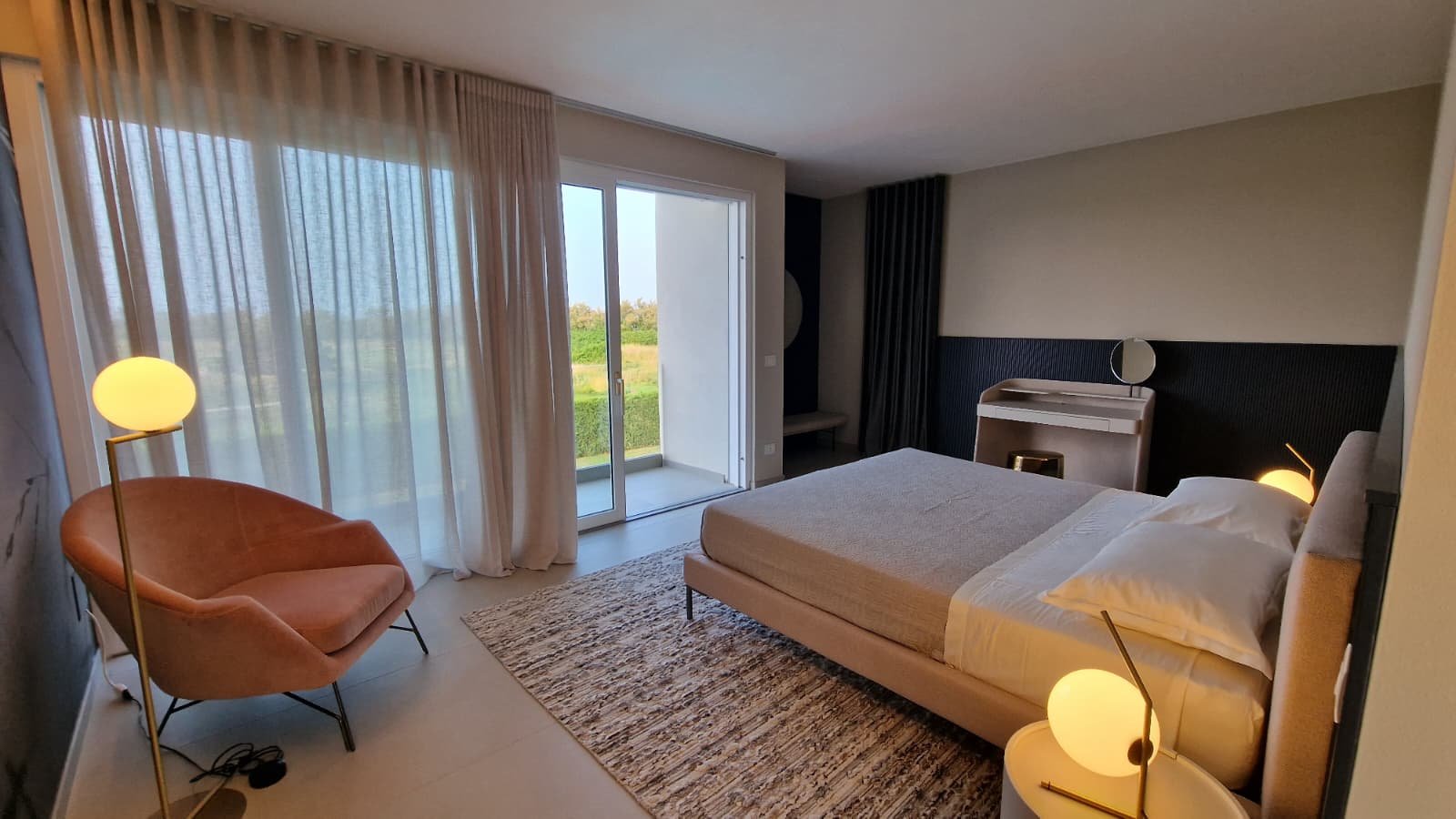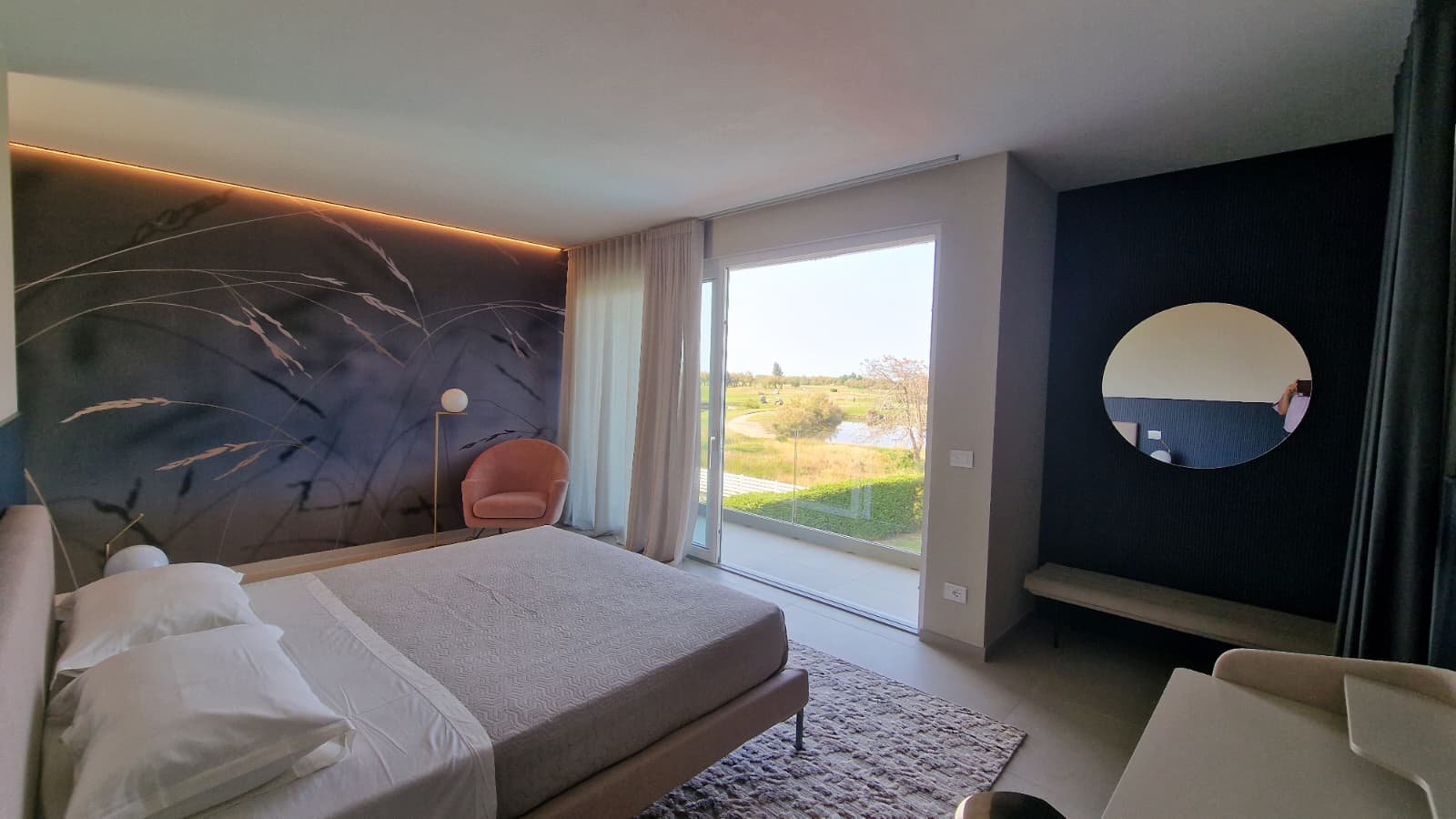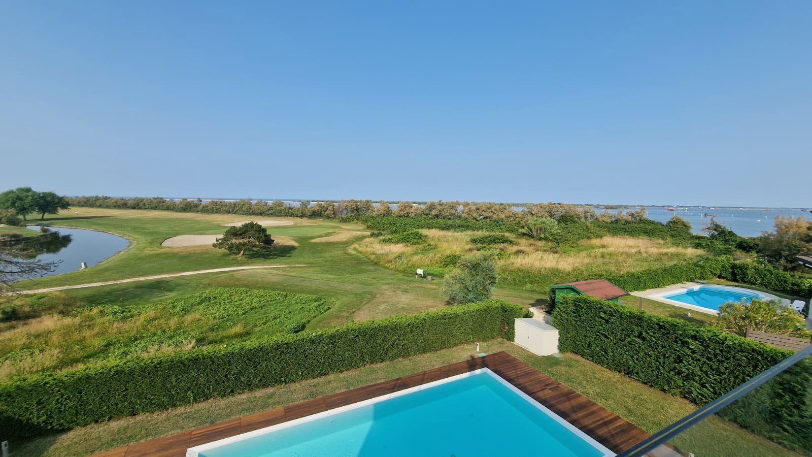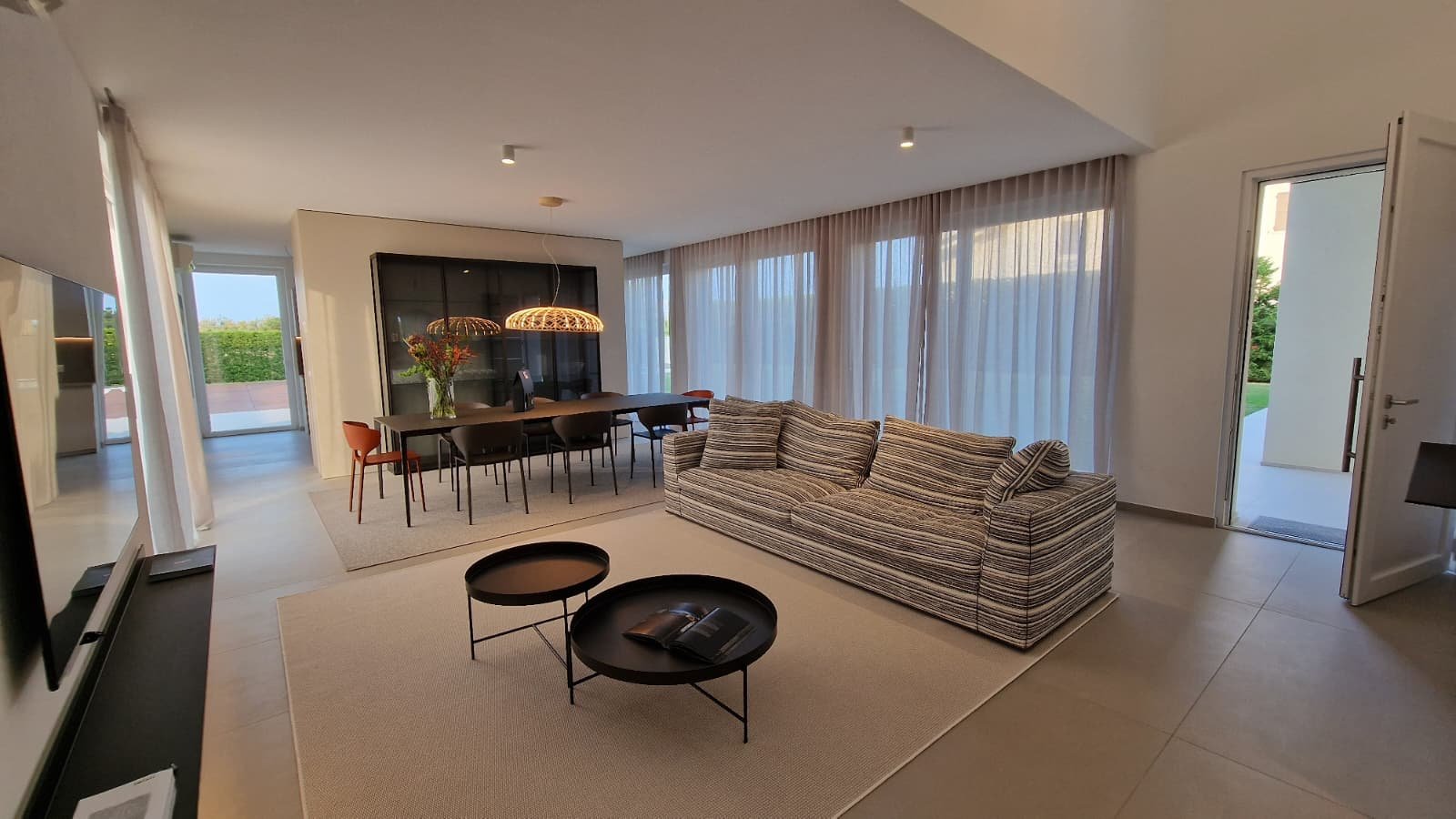 Die Villa erstreckt sich über 450 m² auf drei Ebenen und steht auf einem großzügigen Grundstück von 1.300 m². Lichtdurchflutete Räume, offene Glasfronten und ein fließender Übergang von innen nach außen schaffen ein Wohngefühl voller Leichtigkeit. Das Konzept: maximale Nähe zur Natur. Von jedem Raum aus schweift der Blick über den gepflegten Garten, den weitläufigen Pool und das satte Grün des Golfplatzes.